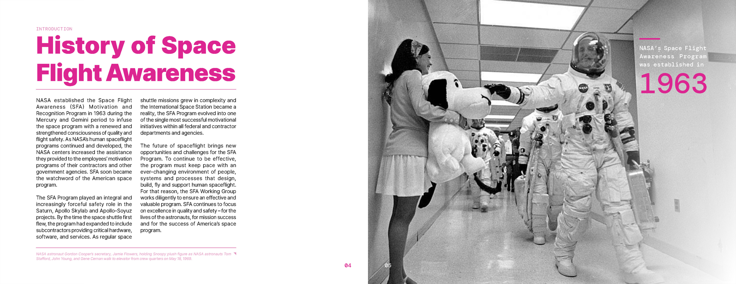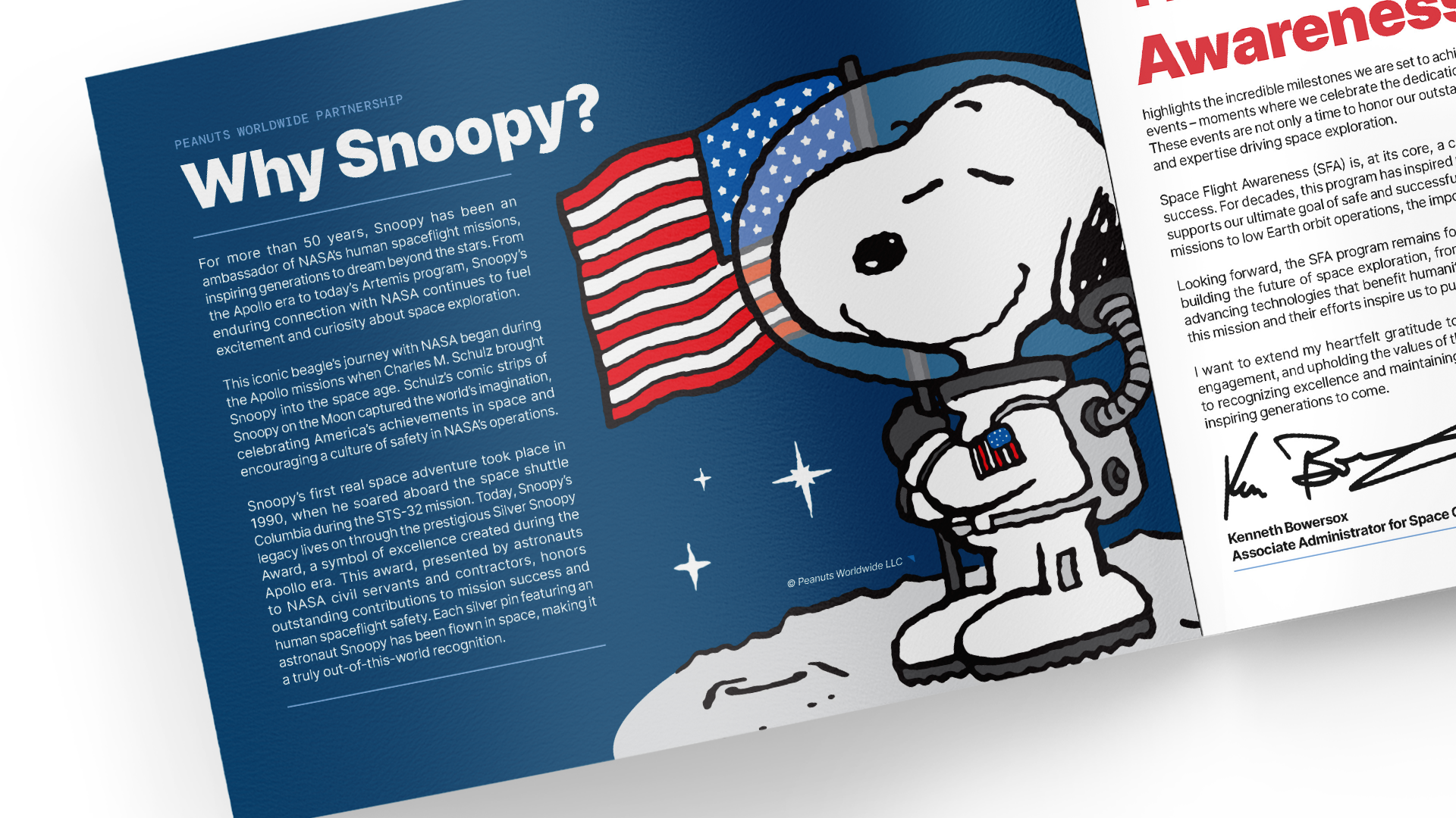 The SFA Program wanted to enhance their brand and identity with the publication of the 2025 SFA Program Plan. The program wanted vivid colors and a clean, modern look while emphasizing Snoopy and NASA’s Peanuts Worldwide LLC partnership. I designed the 22-page program plan by combining NASA and the SFA Program’s branding with Peanuts’ iconic imagery and color palette. The final plan was published on the nasa.gov SFA website and can be viewed here.